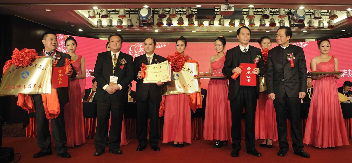 北京市民政局副局长谢延智与陈春玖会长为新成立的食品调味品商会、平潭商会和医疗产业商会会长举行隆重的授牌仪式