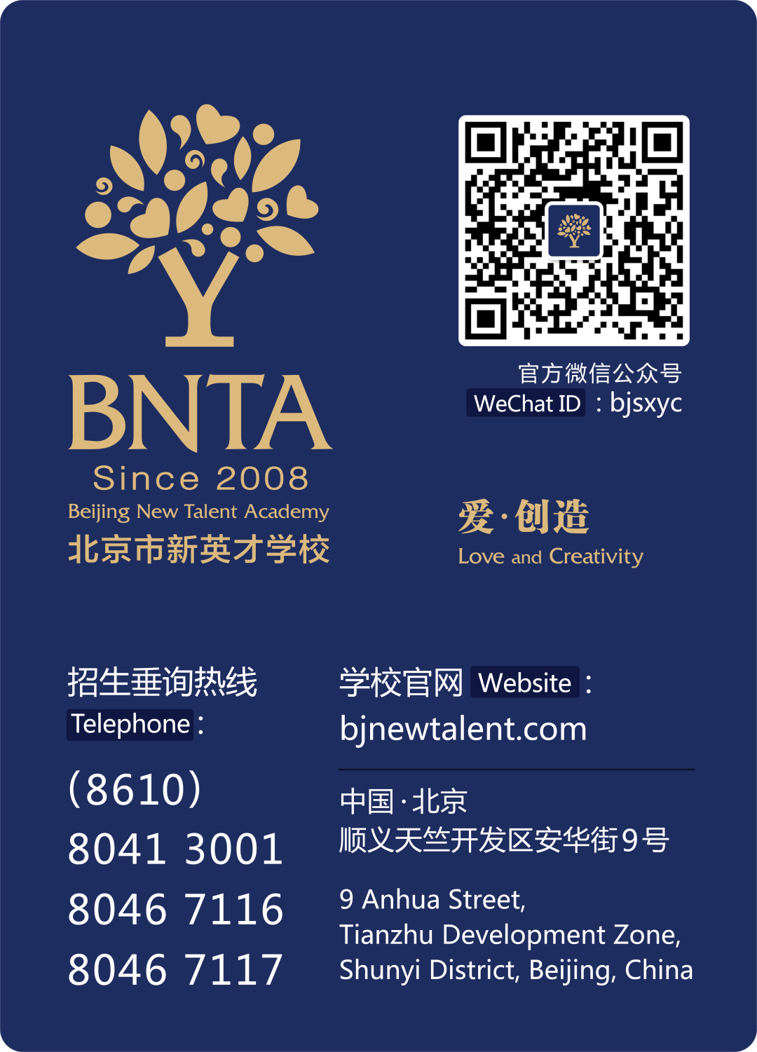 北京市新英才学校愿得天下英才而育之。 2020年秋季招生现已全面开启,面向全国招收2-18岁学生。 *招收班型 □ 幼儿园:托班 / 小班 / 中班 / 衔接班 □ 小学:一至六年级寄宿/走读班、六年级爱创衔接班(对标人大附中早培班) □ 初中:七年级至九年级 □ 高中:国内高考课程班 / 剑桥国际中心IGCSE、A Level课程 / AP课程班 / 艺体特色课程班 □ 英国萨塞克斯大学预科班 *全年接收插班生 新英才知教育 懂未来